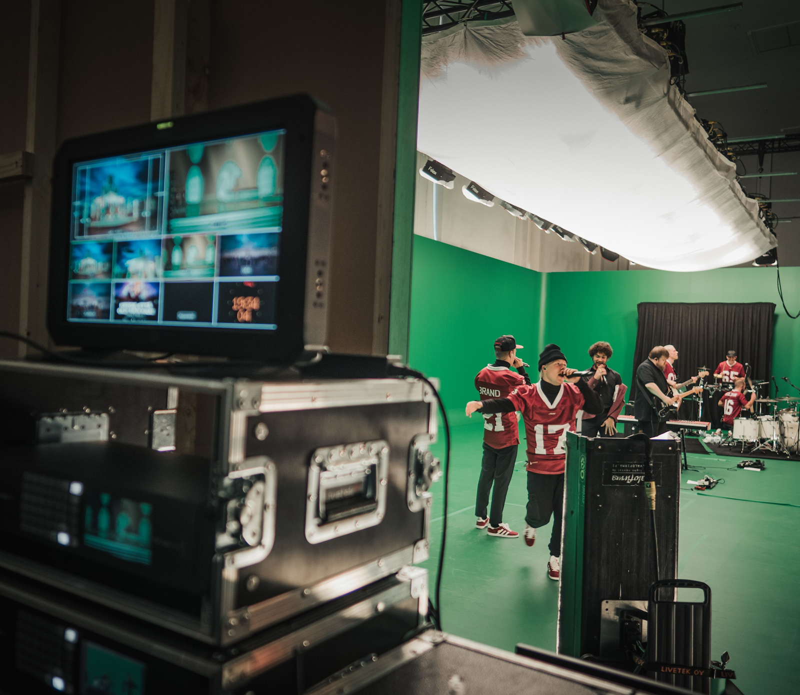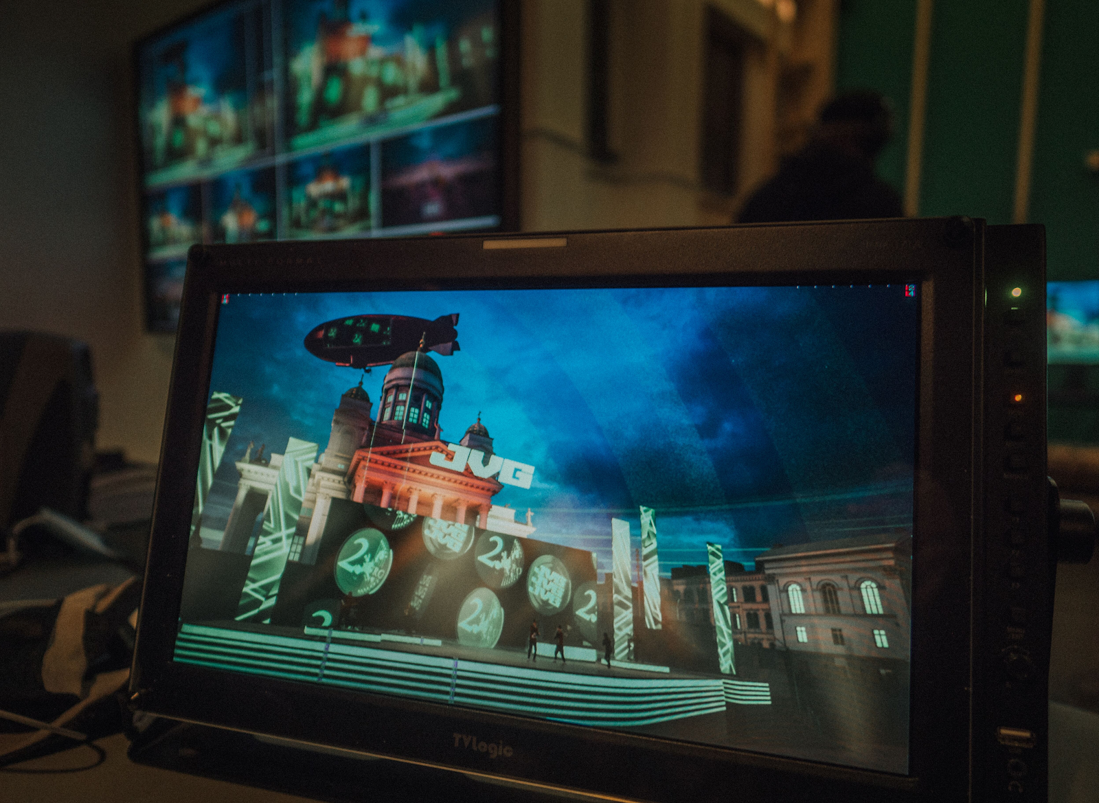 To integrate the artists into the 3D model of Helsinki, JVG performed in front of a green screen, with special effects on the virtual stage. This option positioned the artists against a backdrop without risking high-bandwidth 3D live streamed volumetric capture that is still very much in R&D for live events of this scale.