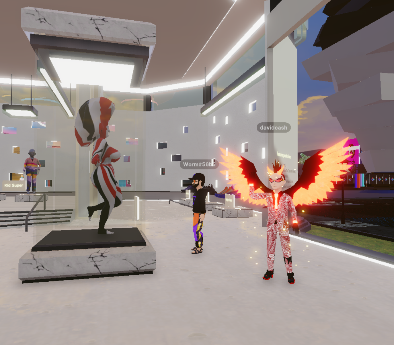 I landed in a familiar low poly environment with boxy rows of stores. There were quite a few avatars running around trying to find the concert, so I did the same. Everyone was congregated in a big spiral building wondering what was going on as things were running late.