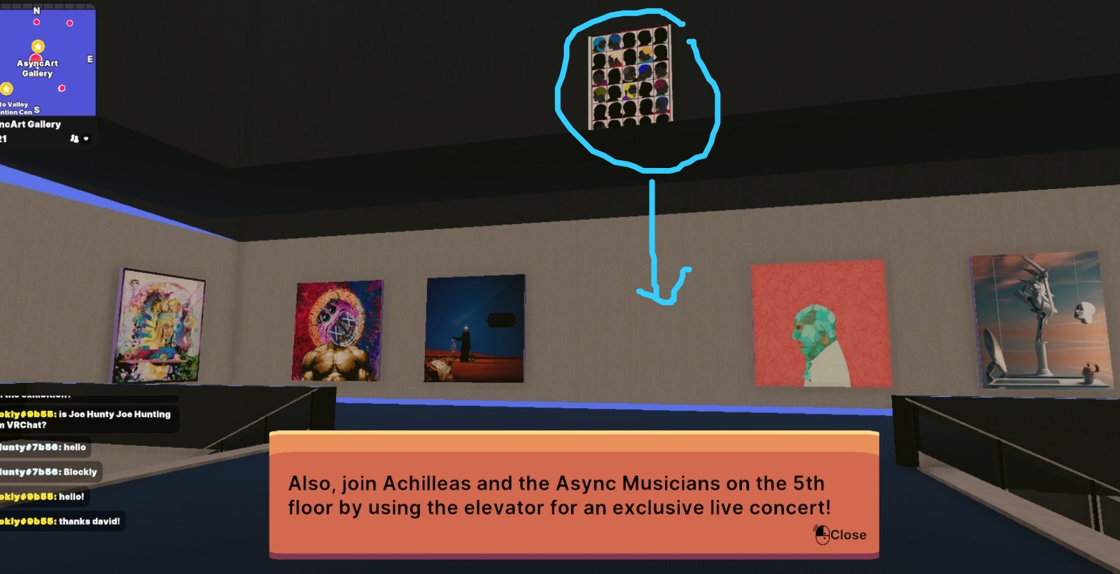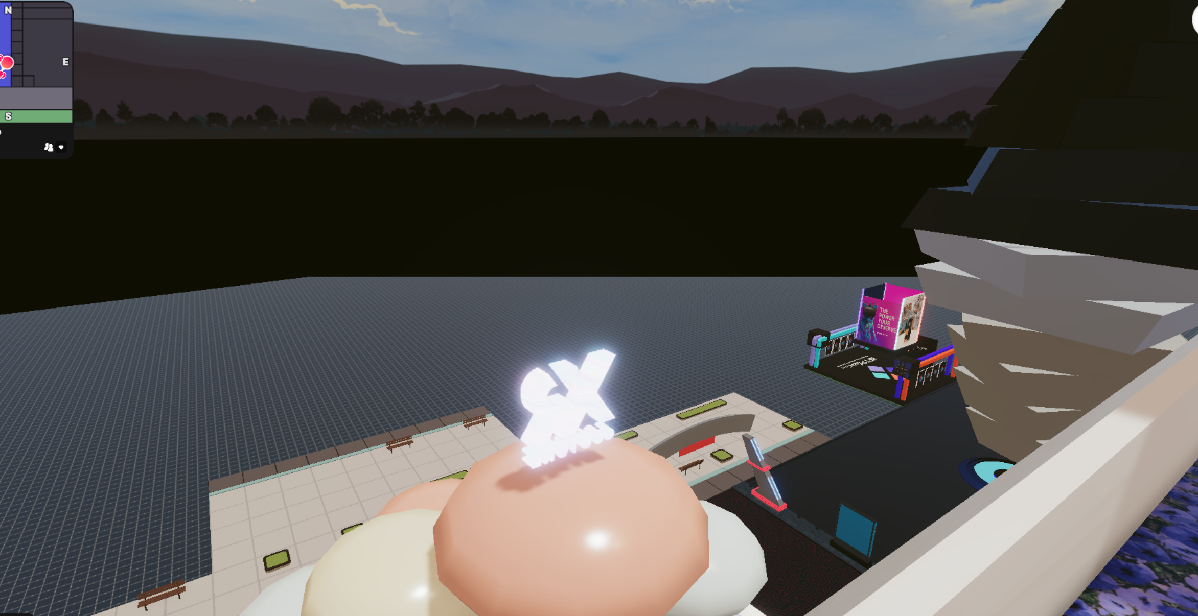 I replied excitedly, for here in pixel was the curator himself. I told him about reading his note and that the fact that he was here made the whole experience worth it. He was showing his friends around the building so I eagerly followed along, discovering that one of the shafts in the middle was an elevator which I’d missed before because the writing had been on the other side. There were four stories to explore! We went up to the rooftop where music blasted from the video playing on a big screen. davidcash ushered us into a temple-like structure where they enjoyed the blissful silence to talk via voice chat.