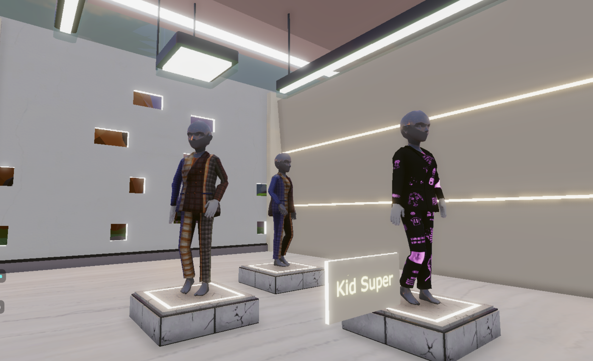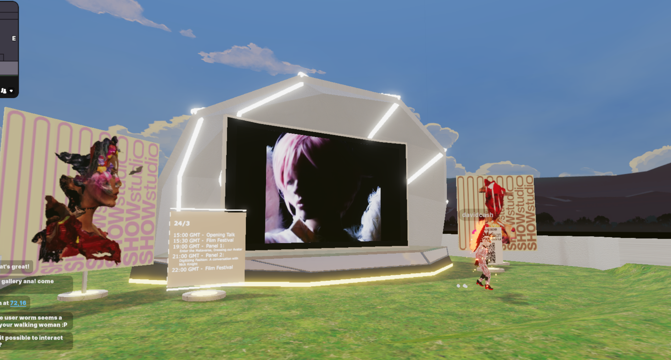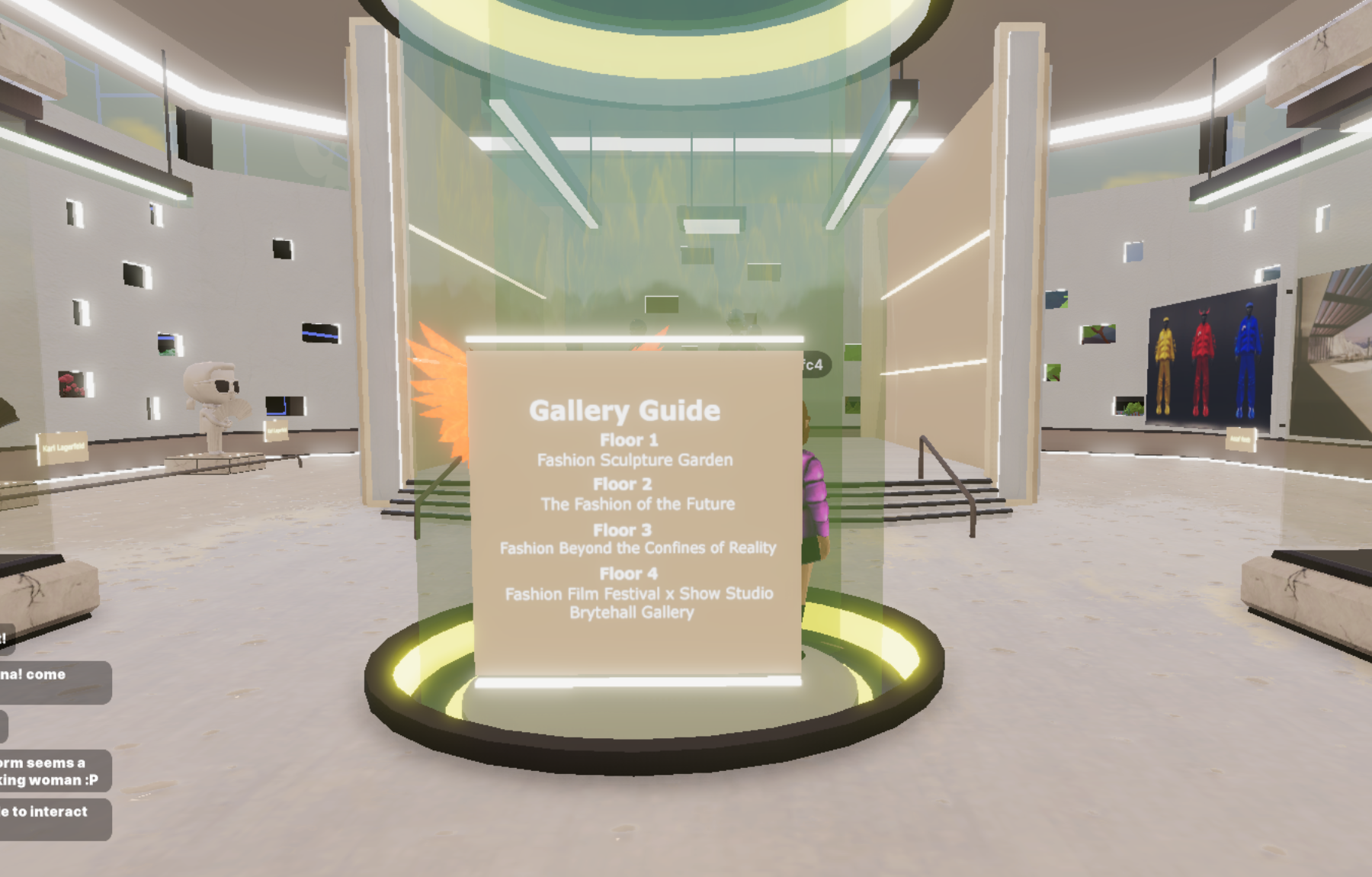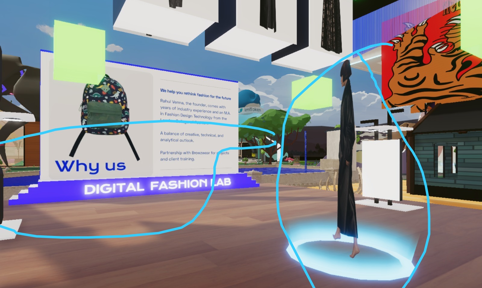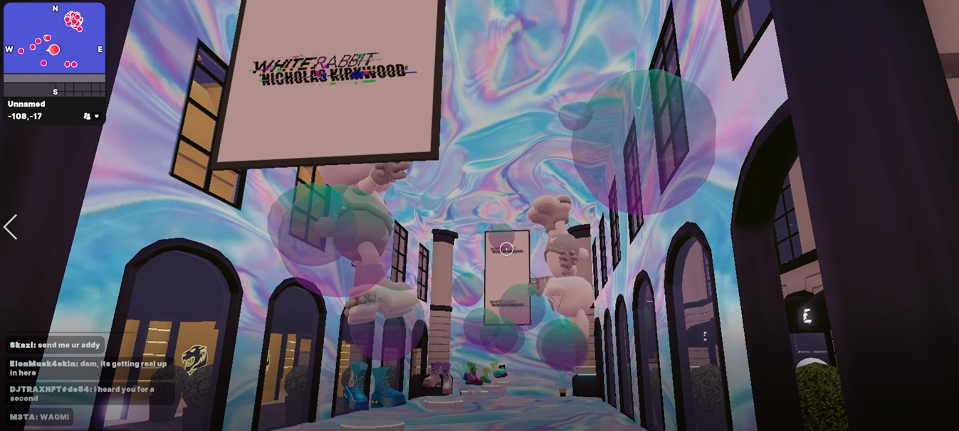 To take advantage of the delay, blockly sprinted into the shops. It looked like all the high-end brands had concentrated in this part of the fashion week as digital garments were much more lovingly displayed as 3D models in colorful stores. Some of them were actually pretty cool like the White Rabbit shop. However, every single one of these stores was empty. No one was there to shop, everyone was there to see Grimes… and Elon Musk.