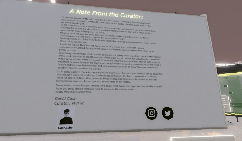 Decentraland’s Metaverse Fashion week, promising the most cutting edge, culturally relevant, designer trends and must-knows, welcomed me with a collection of 2D posters that blockly squinted to read. We plundered onwards, encountering QR code’s featuring crypto news, paid promotional opportunities and PR.